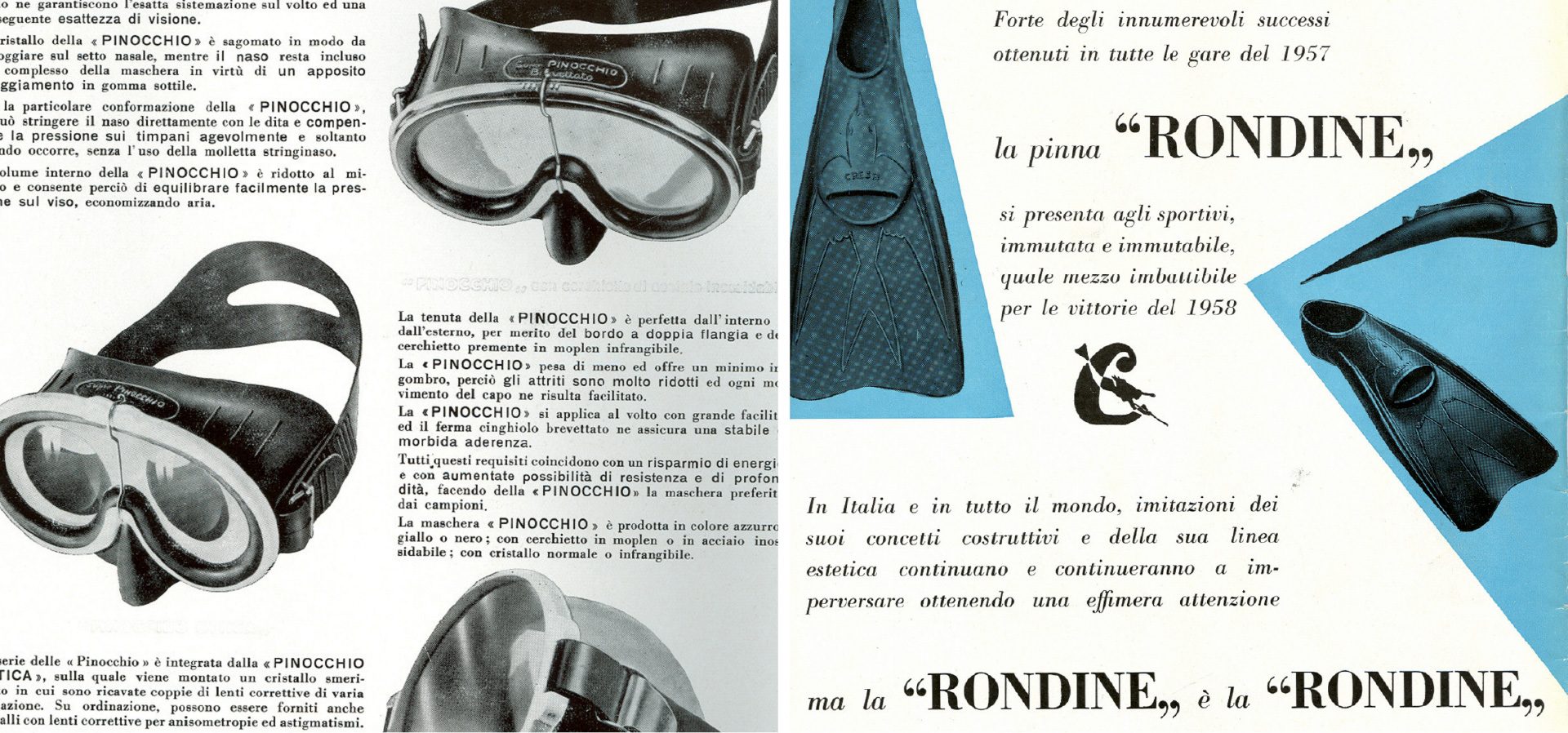 Fins range - Alongside the various rubber fin models, a futuristic model was presented with a reinforced nylon blade,called the Rondine Gara, a fin that thirty years down the line is still going strong,and has been adopted by world class freedivers and spearfishermen the world over.