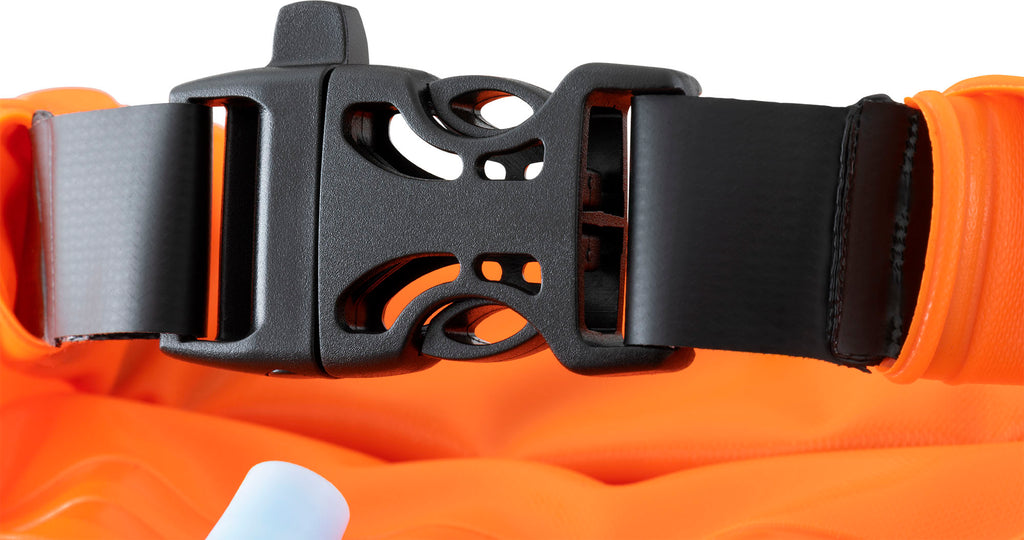 Once packed, the buoy is inflated using an external valve. An adjustable waist strap and lanyard keep the buoy safely attached to you, and for added peace of mind, the top buckle has a built-in emergency whistle.
