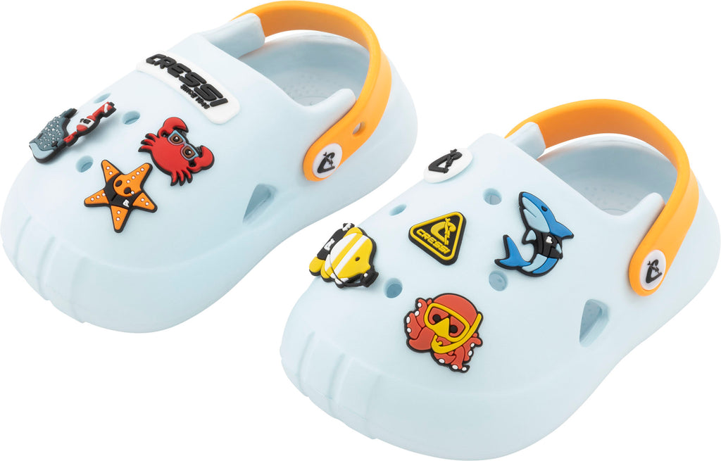 Comfort, lightness and style are the keywords for Cressi Jelly EVA sandals. Thanks to numerous air vents and breathable holes, little feet will always stay cool, even on the hottest days. The heel strap is fully adjustable, with a press-stud fastening and two side holes for width adjustment. The inner sole has an anti-slip pattern and a concave shape, designed to be soft and comfortable for little feet. Jelly sandals can be customised with Hookies: fantastic colourful charms in various shapes, included with the shoes, which make every step endless fun. Perfect for children who love adventure and creativity!
